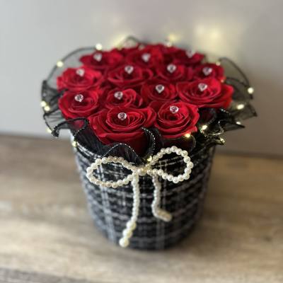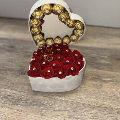 Price: $99.00 HEART VELVET BOX WITH ROSES, EACH ONE WITH ITS FANTASY DIAMOND, METAL CROWN, FERRERO CHOCOLATES, (small size) Product Tags: Best seller Same-day Delivery