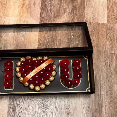 Price: $92.00 Chest with teddy bear, natural red roses, I love you topper, Ferrero chocolates in the drawer Product Tags: Next-day Delivery